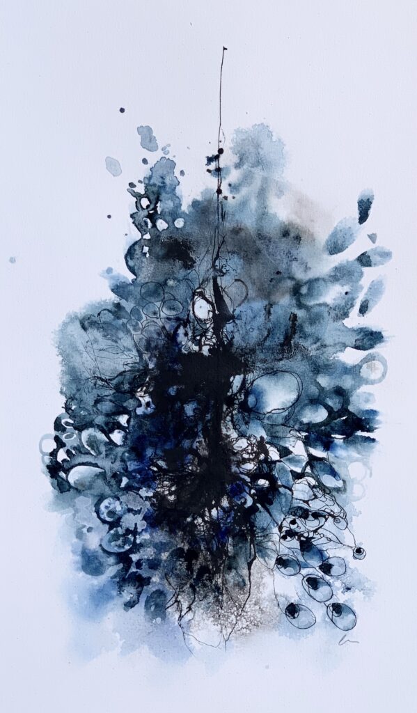 L’aquarelle et la gouache me permettent de travailler par couches, d’accueillir la douceur, l’effacement, la tension. Chaque lavis est un souffle, un voile, une façon de dire sans figer. Le temps y glisse, mêlé à la lumière.